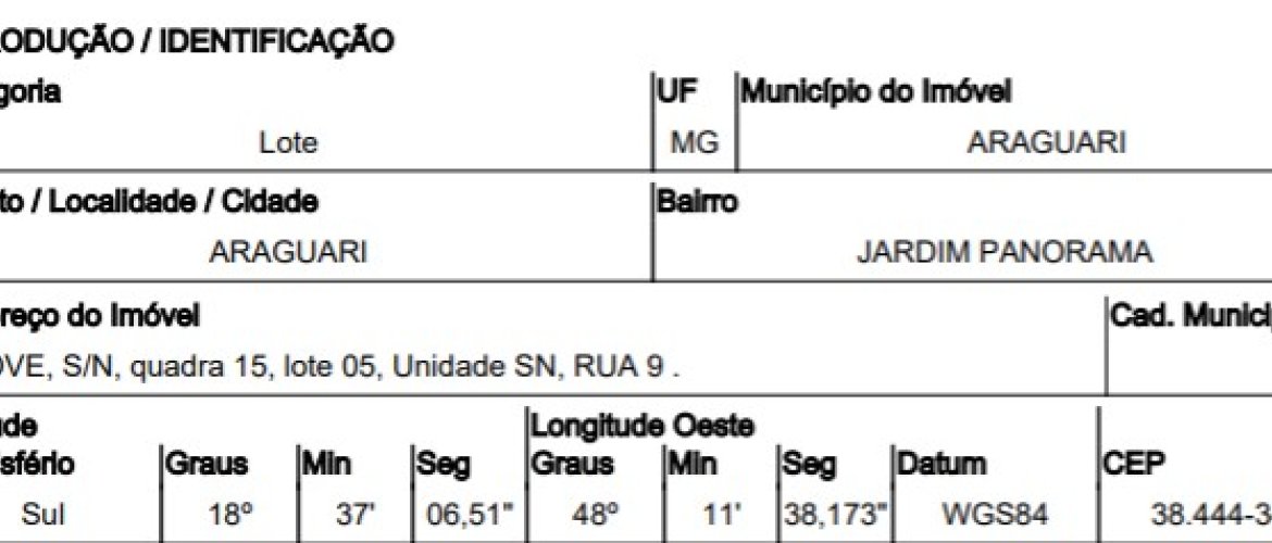 RUA NOVE,N. S/N QD 15, LT 05, JARDIM PANORAMA - CEP: 38444-344, ARAGUARI - MINAS GERAIS nº 15