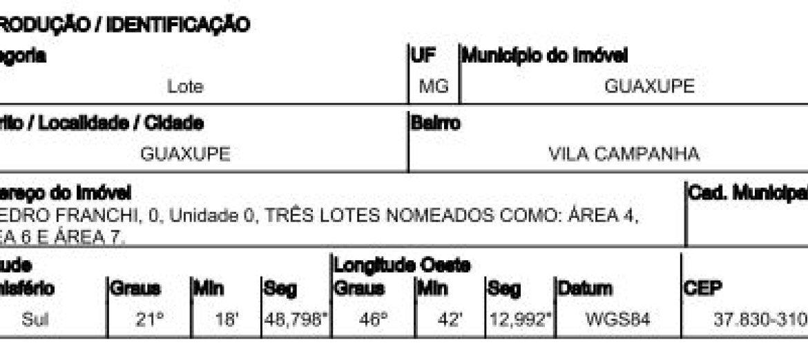 RUA PEDRO FRANCHI,N. 00 ÁREAS 4, 6 E 7, VILA CAMPANHA - CEP: 37830-310, GUAXUPE - MINAS GERAIS nº 00